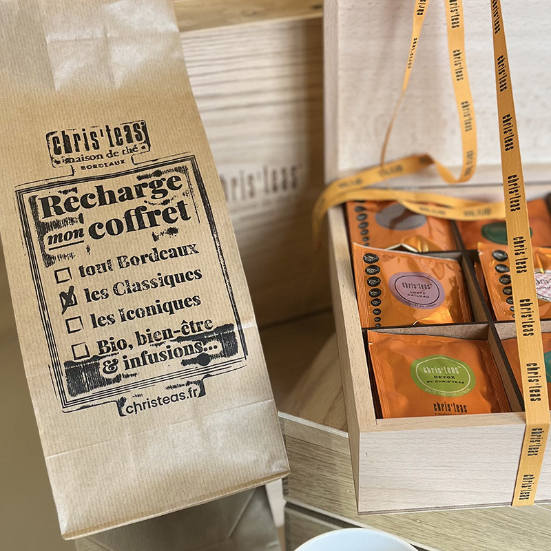 Ce joli coffret en bois de chêne/hêtre est fabriqué sur mesure, en France, à Eysines, par une menuisière, son atelier est situé également sur la Commune d'Eysines, cela s'appelle DU BRUIT DANS LE JARDIN. Elle utilise les bois recyclé de nos forêts et conçoit tout ce que vous voulez, notamment ce coffret spécialement conçu pour ranger tous les thés en sachets pyramidaux de la maison Chris'teas.