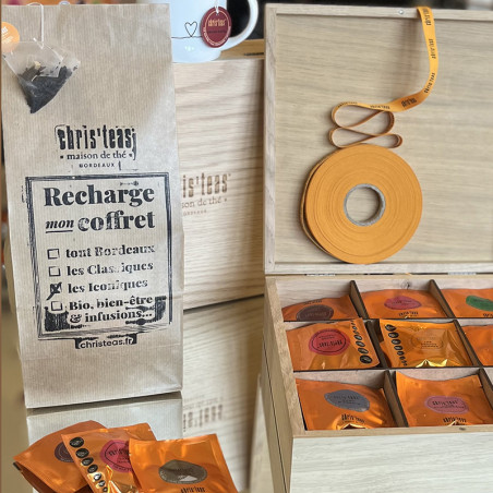 Ce joli coffret en bois de chêne/hêtre est fabriqué sur mesure, en France, à Vertolaye, spécialement pour les thés en sachets pyramidaux de la maison Chris'teas.
