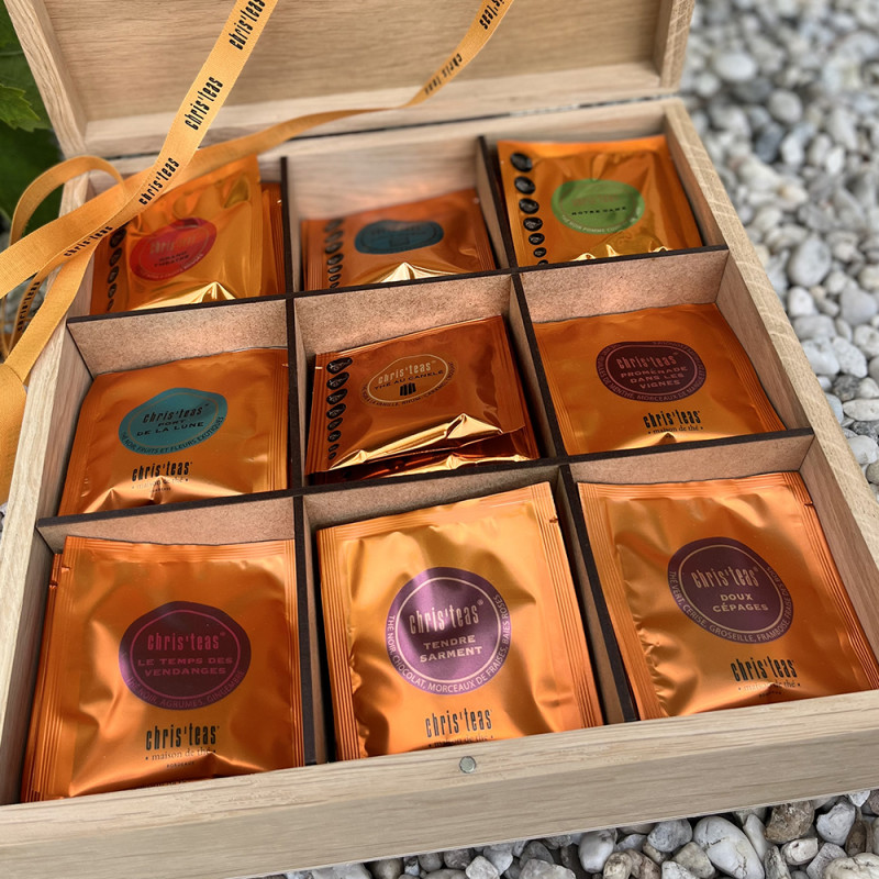 Élégant, durable et rechargeable, ce joli coffret en bois de chêne/hêtre est fabriqué sur mesure, en France, à Vertolaye, spécialement pour les thés en sachets pyramidaux de la maison Chris'teas.