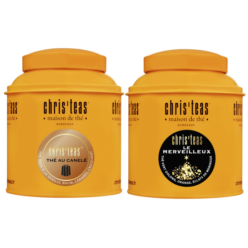 • Thé au canelé : thé emblématique et incontournable de la Maison Chris'teas aux saveurs de la célèbre pâtisserie bordelaise, assemblé avec du thé noir, du rhum, des morceaux de caramel croquant et une pointe de vanille.