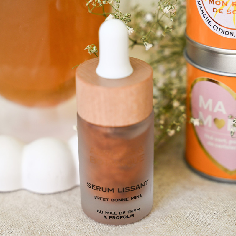 • Le sérum lissant Effet Bonne Mine, au format voyage 10 ml qui donnera immédiatement éclat à votre peau. Véritable concentré d’éclat de miel, ce sérum est un assemblage d’ingrédients naturels qui détendent les traits et donnent un teint lumineux. Aux propriétés lissantes et régénérantes avérées, cette formule est une combinaison unique de miel de thym, de propolis et de 8 actifs botaniques. Aussitôt appliqué, l’effet lissant améliore visiblement l’éclat de la peau. Il pénètre rapidement et laisse la peau douce et prête pour l’application de votre routine quotidienne d’hydratation. Dotés de nacres qui accrochent la lumière et de propolis naturellement orangée, ce sérum «bonne mine» ensoleillera votre teint tout au long de votre journée. À appliquer sur une peau nettoyée avant votre crème de jour.