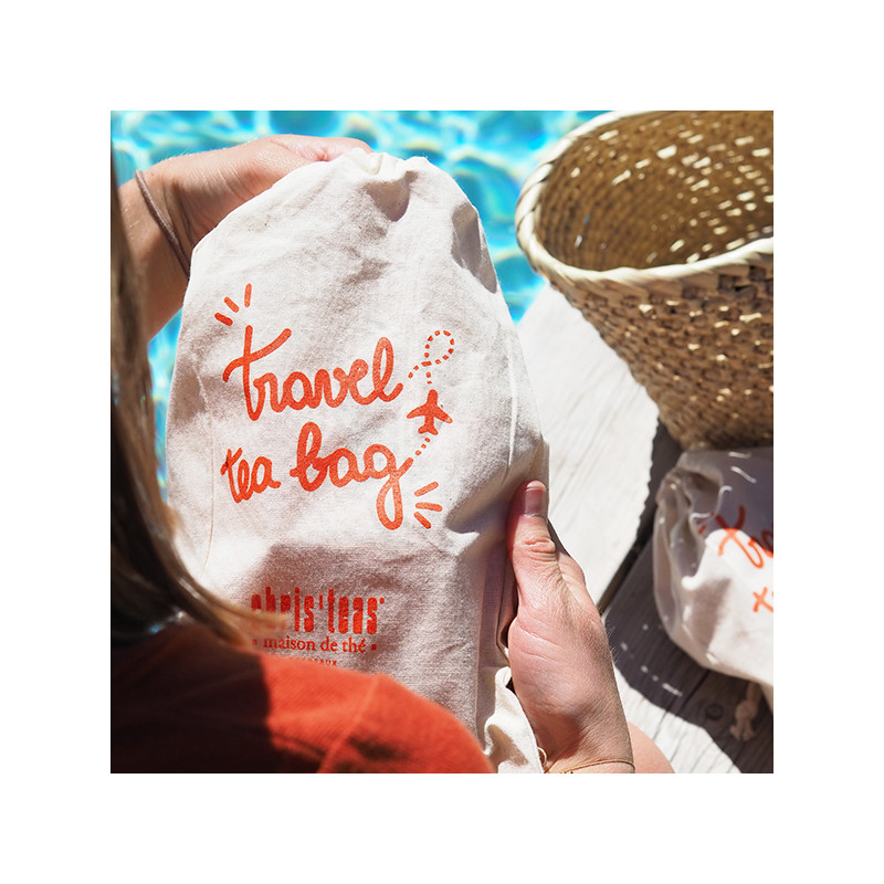 Ce Travel Tea Bag peut contenir 3 pochettes de thé de 100g au choix : un thé noir pour le matin, un thé vert dans l'après-midi et une infusion pour le soir... Remplissez ce joli sac tout en coton de 3 thés de votre choix et rajouter l’infuseur pour faire infuser votre thé les pieds dans l’eau ou au sommet d’une montagne...