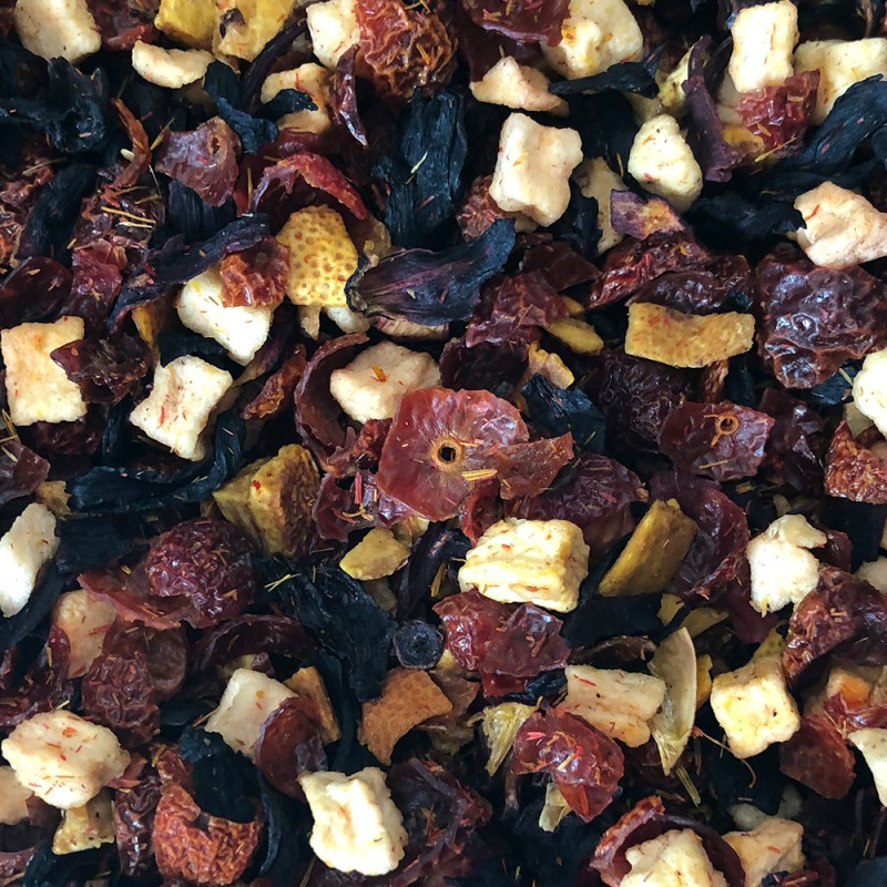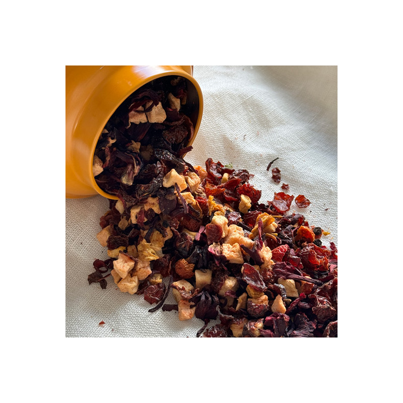 On y retrouve des morceaux de pommes et d’oranges sanguines ainsi qu’une base d’hibiscus et de cynorhodon. Cette association en fait une infusion riche en vitamine C et en fer.