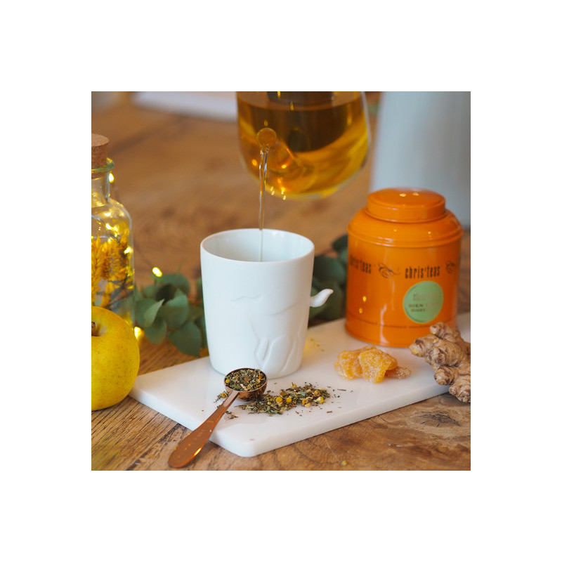 Cette décoction zenifiante est un savant mélange de rooïbos, mélisse, feuilles de mûrier et morceaux d'oranges caramélisées.