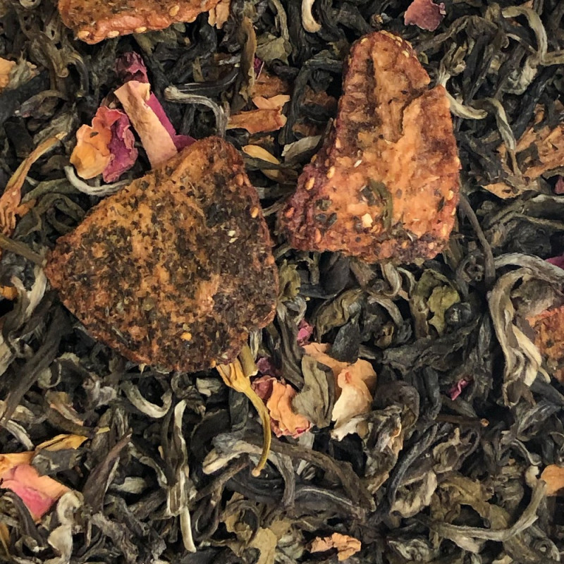 Thé blanc, pétales de rose et violette, jasmin et fraise des bois