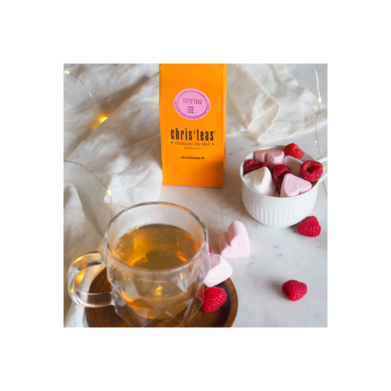 Laissez-vous charmer par notre thé vert "Love love love". Ce thé à la rose et à la framboise est une véritable ode à l'amour, à déguster sans modération.