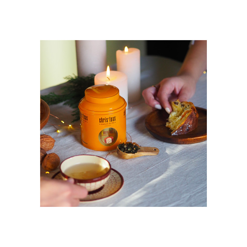 Évoquant l'heure du goûter, Panettone est un thé vert joyeux et festif, mariage harmonieux de fruits confits, raisins, zestes d'agrumes, morceaux de nougatine et jolis cerneaux de noix...
