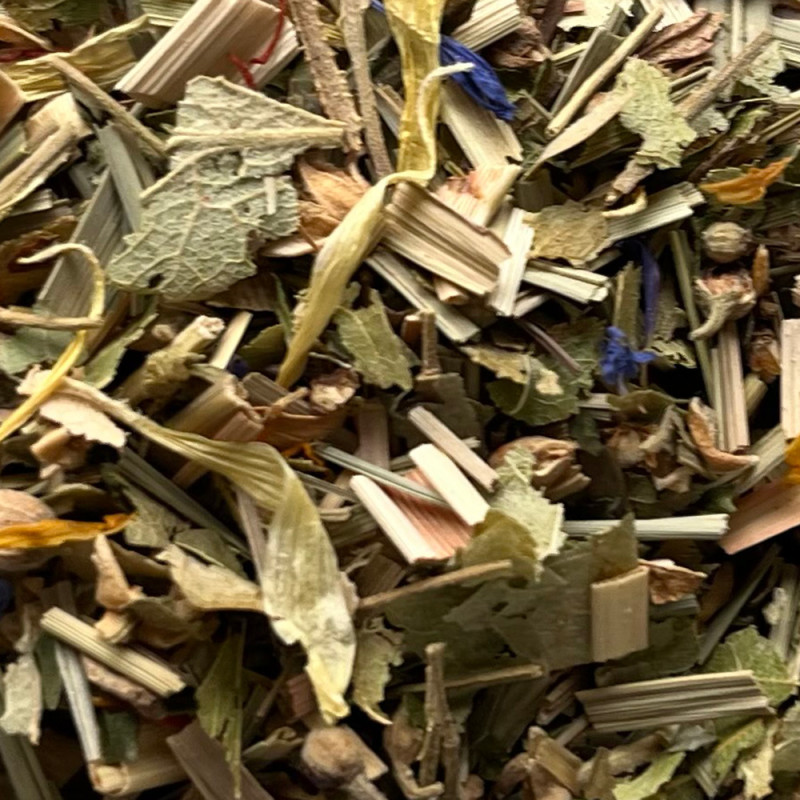 Tilleul, menthe poivrée, fleurs de soucis, carthame et fleurs de bleuet